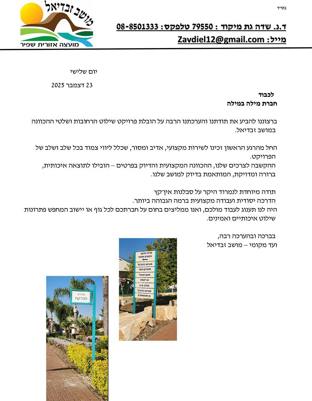 🔹 שלטי יישובים ומועצות מקומיות – שילוט שמאחד את הקהילה ומשדר סמכות ומיתוג יישובי.